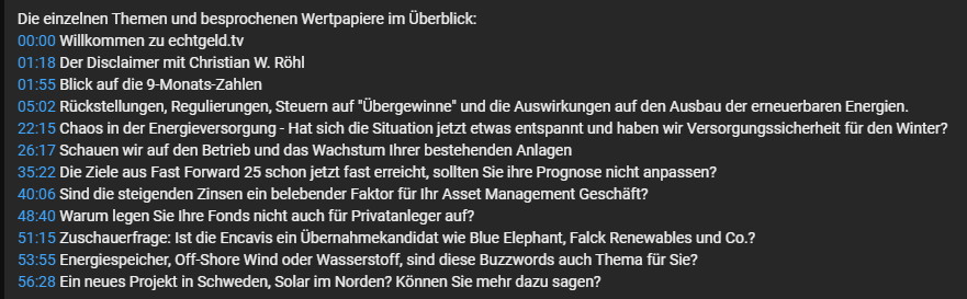 Kramer & Röhl haben mit Encavis CEO Dierk Paskert gesprochen. Sehr interessante Einblicke zum Energiemarkt im Allgemeinen sowie zum business von Encavis im Speziellen (keine Projektentwicklung sondern eigentlich langweiliges bewirtschaften - es werden mE passende Vergleiche zur Immobilienwirtschaft gezogen. Auch eine gewisse Zinssensibilität des Geschäfts wird angesprochen).