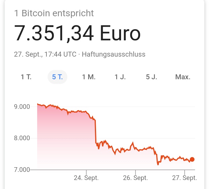 mike4001 September 25, 2019 Naja da lag wohl viel im derzeitigen Preis auf einem erfolgreichen BAKKT Start, der doch sehr verhalten war. Hab natürlich nach wie vor keine Ahnung ob es nochmals richtig aufwärts geht, oder ob es das gewesen ist. Positiv ist, dass nächsten April (oder wars Mai), das nächste Halving ansteht. Viel mehr zu sagen gibt es glaube ich auch nicht. Bitcoin war schon immer höchst spekulativ und es kann morgen wieder auf 10.000 USD steigen, aber auch auf 7.000 USD fallen. Und keines der beiden Szenarien würde mich überraschen ;-) Ich selbst bleibe aber investiert, auch wenn mir die Summe mit der ich drin stecke viel zu hoch ist. Steigt es nochmal richtig freue ich mich, ansonsten verkaufe ich eben bei +/- 0 und das Bitcoin Experiment ist für mich gescheitert. Diesen Beitrag teilen Link zum Beitrag