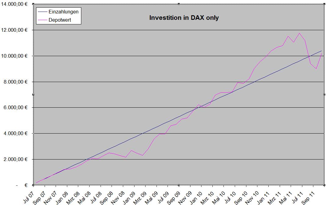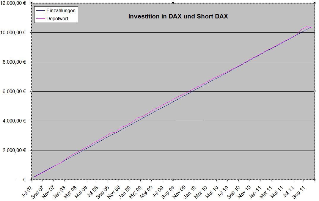 postguru November 6, 2011 Hast Du das 'mal mit historischen Daxdaten überprüft? Pfadabhängigkeit auch berücksichtigt? Die Variante ist so spannend, wie einem Nagelpilz beim Wachsen zuzuschauen. Es wurde die Variante durchgespielt immer in den Depotteil die Rate zu packen, der den geringsten Anteil hat. Zeitraum 01.07.2007 bis 31.10.2011 Ergebnis: Investition = 10.400,00 Euro Ergebnis = 10.323,60 Euro Da wäre Tagesgeld besser gewesen Ist aber noch besser als DAX long Ergebnis = 10.203,07 Euro Dann würde ich wahrscheinlich zur Absicherung eher diesen nehmen "Lyxor ETF Daily Leveraged Bund" Der ist aber noch nicht lange auf dem Markt, Fondsauflage 07.06.2011 ist also eher das Bauchgefühl. Diesen Beitrag teilen Link zum Beitrag