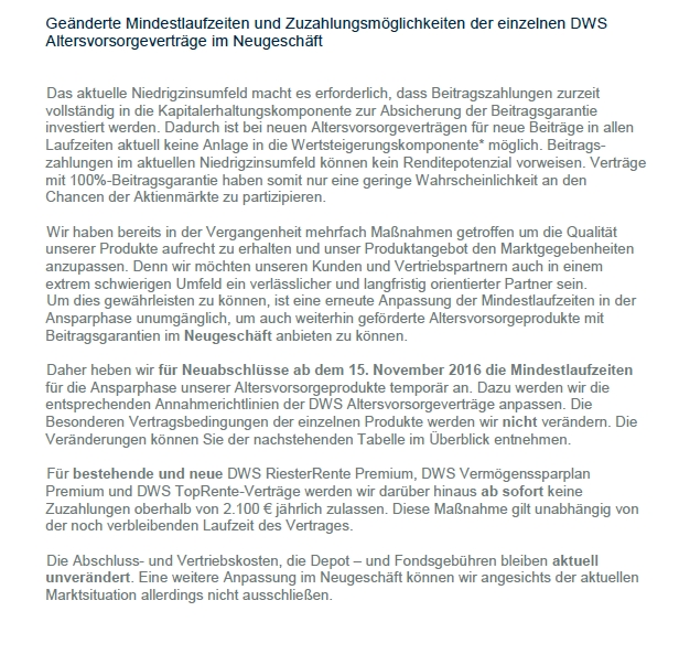 Gerald1502 August 8, 2012 · bearbeitet August 8, 2012 von Gerald1502 Hinweis an zukünftig ratsuchende User. Schaut bitte bevor ihr hier eine Frage stellt in Euren Unterlagen nach, ob es sich wirklich um den Fondssparplan Riester Rente Premium der DWS handelt, oder nicht doch um die Zurich Förder Rente Invest DWS Premium Ist jetzt schon zweimal passiert, dass hier das falsche Produkt besprochen wurde, was durchaus mal passieren kann. Viele Grüße Gerald Diesen Beitrag teilen Link zum Beitrag