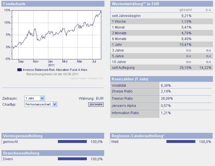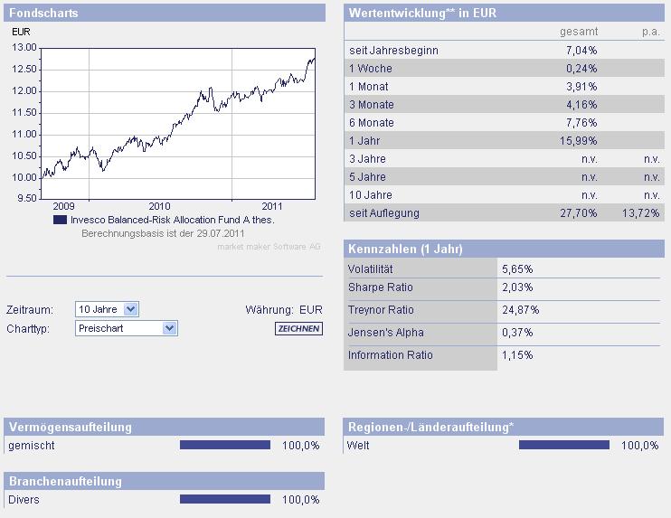 ghost_69 Juli 31, 2011 Invesco Balanced-Risk Allocation Fund A LU0432616737 / A0N9Z0 = thesaurierend LU0482498176 / A1CV2R = ausschüttend Fondsporträt Ziel des Fonds ist die Erwirtschaftung einer Gesamtrendite mit niedrigen bis mäßigen Korrelationen bezogen auf die traditionellen Finanzmarktindizes durch ein Engagement in folgende 3 Vermögensklassen: Renten, Aktien und Rohstoffe. Der Fonds verfolgt zwei Hauptstrategien: Mit der ersten wird versucht, den Risikobeitrag jeder der drei Vermögensklassen mit dem Ziel auszugleichen, die Wahrscheinlichkeit, das Ausmaß und die Dauer von Kapitalverlusten zu mindern. Mit der zweiten wird versucht, die Allokation unter den Vermögenswerten mit dem Ziel zu verlagern, die erwarteten Renditen zu steigern. Basisdaten WKN / ISIN: A0N9Z0 / LU0432616737 Fondsgesellschaft Invesco Management S.A. Fondsmanager Herr Scott Wolle Anlageregion Welt Anlageschwerpunkt Mischfonds ausgewogen Benchmark 60% MSCI World, 40% JPM Gov Bond (hedged into euros) Risikoklasse 3 Fondsvolumen 99,46 Mio. EUR (alle Tranchen) Auflegungsdatum 01.09.2009 Ertragsverwendung thesaurierend Geschäftsjahr 1.3. - 28.2. Garantie Nein Laufzeit unbegrenzt Kauf / Verkauf Ja / Ja VL-fähig Nein Kosten Ausgabeaufschlag (effektiv) 5,25% (4,98%) Depotbankgebühr p.a. 0,20% Managementgebühr p.a. 1,25% Gesamtkostenquote (TER) 2010 1,71% Das Fachsheet: Invesco Balanced-Risk Allocation Fund A thes.pdf von der Gesellschaft: Invesco Balanced-Risk Allocation Fund A thes.pdf Auch hier weiß man nicht genau was drin steckt, aber ich finde diese Anlageklasse interessant. Ghost_69 :- Invesco Balanced-Risk Allocation Fund.pdf Diesen Beitrag teilen Link zum Beitrag