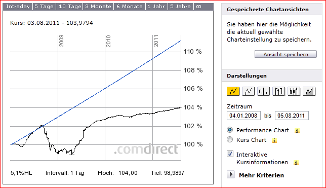 Schinzilord August 4, 2011 · bearbeitet August 4, 2011 von Schinzilord Das ist Garantierotz, sorry für die Ausdruckweise. Wenn ich mir die Hauptbestandteile so ansehe klopft das Herz gleich etwas schneller. http://www.comdirect...TATION=29399534 Damit ich das richtig übersetze.... relative sicher aber dafür wenig Rendite???? Leider nein...das heißt: Viel zu viele Risiken für die mickrige Rendite, also ein schlechtes Verhältnis aus Rendite / Risiko. Ein Tagesgeld / Festgeld in Kombination mit ein bisserl AktienETF wäre das bei weitem besser gewesen...und da ist der AA noch gar nicht mit abgezogen. Also Garantieprodukt selbst zusammengebaut: Genausoviel sicher festverzinslich anlegen, dass am Ende 100% rauskommen. Dann je nach Investitionszeitraum den Restbetrag riskant in AktienETF stecken -> selbstgebasteltes Garantieprodukt mit minimalen Kosten ohne AA. Der Fonds war übrigens nie als sicher konzipiert worden: http://daten.comdirect.de/funds/issuer/report.pdf?XXID=10453%25252C0%25252CFRpeis2%25252F6OIyXn9Gq2kAag%25253D%25253D%25252CXID%25252CcG8GfED4u1x3skwtAR%25252FBfvvA4ATSUmZtqSxzK11AXLwtHd4B34QMHmJhq%25252F2PRGZE&ID_TYPE_REPORT=51&HASH=10453%3Bf8e8f9b2e7918785d7eb623bfc357b3f&ID_INSTRUMENT=22378324&VERSION=2&YEAR=2011&ID_CONTINGENT=1129 er hat auf der Risikoskala eine 4/7, also mittleres Risiko. Jetzt überstürze nix, hauptsache, du selbst bekommst es FÜR DICH auf die Reihe, das bringt dir selbst langfristig mehr. Diesen Beitrag teilen Link zum Beitrag