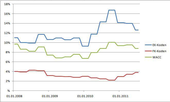marky2k August 24, 2011 · bearbeitet August 24, 2011 von marky2k Also Marktkapitalisierung ist doch per Definition Anzahl an Aktien * Aktienpreis. Das ist demzufolge auch der Marktwert des EK. http://de.wikipedia....kapitalisierung Entweder man nimmt einfach an, dass es zB 20% EK und 80% FK sind oder man schaut eben nach welche Marktkapitalisierung das Unternehmen hat und nimmt das als EK an und der Marktwert des FKs entspricht dann den verzinslichen Finanzverbindlichkeiten, die aus der Bilanz abzulesen wären? Mir ist eigentlich nur die letztere Möglichkeit bekannt. Dass man einfach x% EK und x% FK annimmt, halte ich für sehr fragwürdig. Das ultimative Ziel einer Bewertung ist ja letztendlich der Kauf oder Verkauf und der erfolgt zu Marktwerten. Deswegen sollten auch Marktwerte in die Formeln einfließen und keine Buchwerte, zu Buchwerten kauft es dir evtl. keiner ab. Genausowenig kannst du also x% EK für die Formel annehmen. Das macht mMn nur Sinn, wenn du keine Marktwerte zur Verfügung hast. Dann kannst du x% EK und x% FK annehmen, findest auf Grund dieser Annahmen eine Schätzung für die Marktwerte des EK und FK. Dann solltest du aber diese Schätzungen wieder in die WACC einsetzen für die ursprünglichen FK und EK Werte und eine neue Schätzung berechnen. Die neue Schätzung kannst du nochmal einsetzen usw., das nennt man dann Iteration. Es ist neben der Annahme der konstanten Kapitalkosten eine weitere Möglichkeit das Problem des Zirkelschlusses zu umgehen. Das ganze kannst du theoretisch auch machen, wenn du mit den Marktwerten von FK und EK anfängst. Das macht aber nicht soviel Sinn, wie wenn du keine Marktwerte zur Verfügung hast. Diesen Beitrag teilen Link zum Beitrag