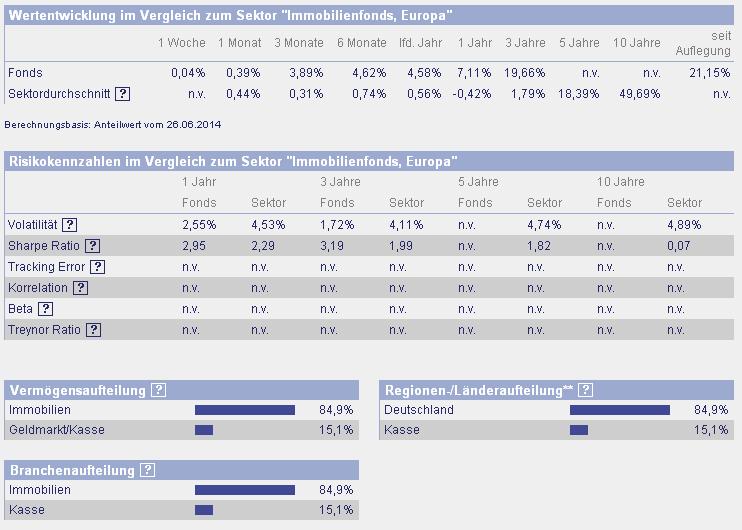 ghost_69 Juni 27, 2014 WERTGRUND WohnSelect D Fondsporträt Als Anlageziele des Fonds werden regelmäßige Erträge auf Grund zufließender Mieten und Zinsen sowie ein langfristiger Wertzuwachs angestrebt. Der Fonds investiert ausschließlich in deutsche Bestandswohnimmobilien. Basisdaten WKN / ISIN: A1CUAY / DE000A1CUAY0 Fondsgesellschaft TMW Pramerica Property Investment GmbH Fondsmanager Wertgrund Immobilien AG Anlageregion Europa Fondskategorie Immobilienfonds Asset-Schwerpunkt n.v. Fonds-Benchmark n.v. Risikoklasse 2 Fondsvolumen 195,13 Mio. EUR (alle Tranchen) Auflegungsdatum 20.04.2010 Ertragsverwendung ausschüttend Steuerstatus transparent Geschäftsjahr 1.3. - 28.2. Kauf / Verkauf Ja / Ja Vermögenswirksame Leistungen nicht möglich Hinweistext Achtung: Bitte beachten Sie die Besonderheiten gem. Verkaufsprospekt für Verkäufe und sprechen Ihren Berater an. Kosten und Gebühren Ausgabeaufschlag (effektiv) 5,00% (4,76%) Depotbankgebühr p.a. 0,03% Managementgebühr p.a. 1,10% Performancegebühr 25,00% des Betrages, der zur Überschreitung einer Rendite des Fonds von 5,0% nach der BVI-Methode geführt hat wenn ich auf den Artikel klicke komme ich auf diese Seite: http://inprimo.de/ aber da steht nichts von diesem Fonds ! wenn ich auf die Seite der Gesellschaft aus dem Depot klicke, komme ich auf folgende Seite: http://www.weltfonds.de/ doch da finde ich nichts über den Fonds. Ich wollte das Teil nur mal vorstellen und bin gespannt wie lange der sich hält. Ghost_69 Diesen Beitrag teilen Link zum Beitrag