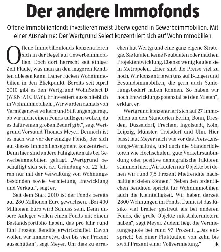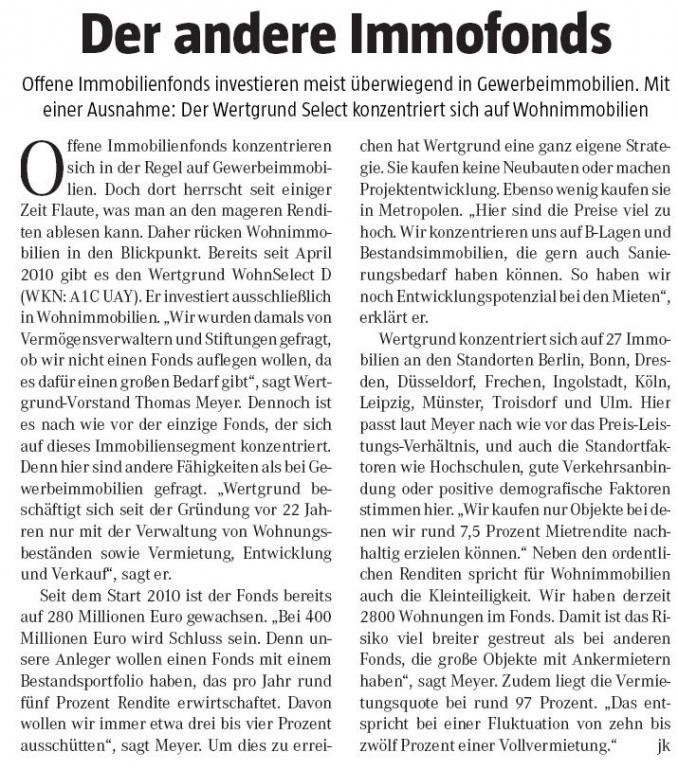 Profiler April 2, 2015 · bearbeitet April 2, 2015 von Profiler Der Wertgrund Wohnselect D ist ein Top-Immofonds für Kleinanleger. Annehmbare Ausschüttungsrendite und sehr gute Anteilspreisentwicklung (wegen Höherbewertung der Immobilien) in den letzten Jahren. Der Fonds ist auch aus Diversifikationsgründen interessant, da er als bisher einziger in deutsche Wohnimmobilien investiert. Momentan nimmt die Gesellschaft keine Anlegergelder mehr entgegen (sog. Cash-Stop). Hintergründe hierzu siehe angehängte Datei. An inländischen Börsen wird der Fonds aber nach wie vor rege gehandelt. Allerdings zahlt man für neue Anteile aktuell ca. 3% Aufschlag (!) auf den offiziellen Rücknahmepreis. Mitteilung vom 23. März 2015.pdf Diesen Beitrag teilen Link zum Beitrag