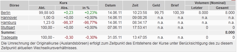 fabus Juni 16, 2011 Die DB hat gerade geantwortet. Ich vermute mal, dass sie auch die Rückzahlung meinen .... Offenbar haben sie falsch gemeint. Bei mir hat die DB per 14.06. Zinsen bis 13.06. und Rückzahlung gebucht. Auf der H&K Website gibt es keine Investor Relations Infos. Chaotenbanden. Bei der ING-DiBa habe ich nun auch die Rückzahlung inkl. Zinsen gebucht bekommen. Diesen Beitrag teilen Link zum Beitrag