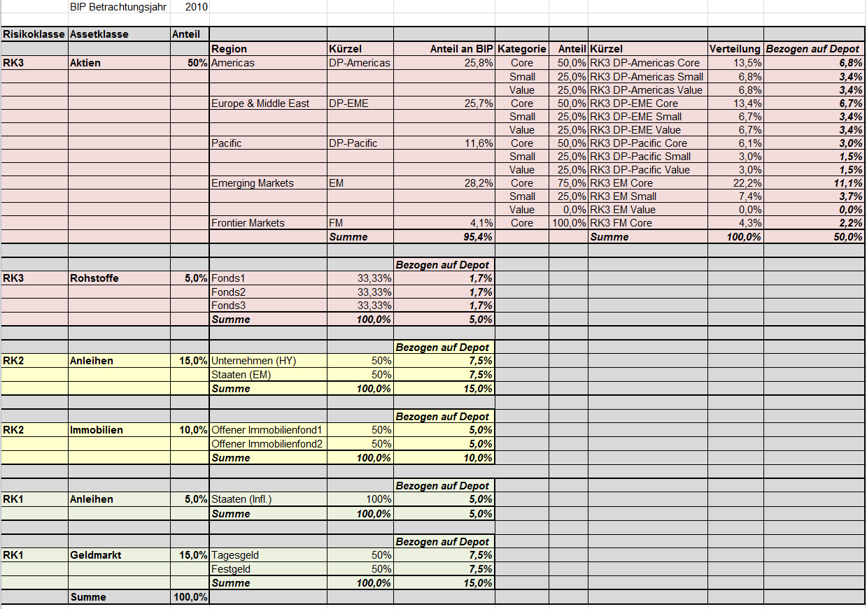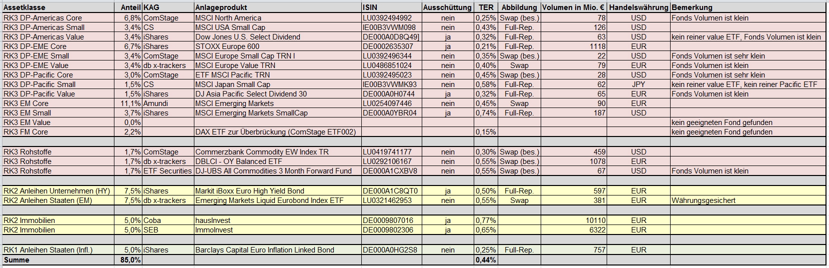 BoersenMuh September 26, 2011 · bearbeitet September 26, 2011 von BoersenMuh Was ich erkennen kann, ist die Erhöhung des Anteils von Staats- und Schrottanleihen. Damit hast Du nichts wesentliches geändert. Wenn Du Kritik wünschst, musst Du auch zeigen, dass sie irgendetwas bewirkt, sonst macht sich keiner die Mühe, sich mit Deinen Plänen kritisch auseinanderzusetzen. Hallo Adun, es ist jetzt "leider" durch die zahlreichen Antworten etwas unübersichtlich geworden. Ich hatte in einem früheren Beitrag geschrieben, dass wie vorgeschlagen die Immobilien jetzt in RK2 eingeordnet werden (was ich ursprünglich falsch gemacht hatte) und dass mir dadurch das Risiko etwas zu hoch geworden ist weshalb ich 5% vom Aktienteil in den Anleihen Teil gepackt habe (meiner Meinung nach ist das Risiko dort geringer als bei Aktien - was doch richtig sein dürfte?!?). Kurz nachdem ich das geschrieben hatte hat supertobs noch gemeint dass er den RK2 Anteil für etwas zu klein hält worauf ich nochmal 5% von den Aktien dorthin umgeschichtet habe (dazu hatte ich bislang nichts geschrieben was mir wohl entgangen ist). Offene Immobilienfonds kommen in den Beiträgen nicht so gut weg weshalb ich mir dort noch nicht ganz sicher bin wie hoch der Anteil letztlich sein soll... sicher ist für mich nur, dass ich sie zur Diversifikation mit drin haben möchte (mit mind. 5%). Ich betrachte sie als Inflationsschutz (natürlich haben Aktien diesen Effekt auch aber die Korrelation zur Inflation dürfte ja nicht genau so hoch sein wie bei Immobilien!!?). Gruß Diesen Beitrag teilen Link zum Beitrag