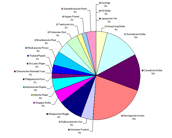 Mir geht es darum, möglichst kostengünstig in Fremdwährungen - egal ob hart oder weich - investiert zu sein. Jedenfalls werde ich mir die nächste Zeit eine weltweite Diversifikation zusammenbasteln mit den Kernwährungen NOK/CAD/AUD, welche in diesem Devisenbasket 40% ausmachen. Der Rest wird weltweit gestreut.