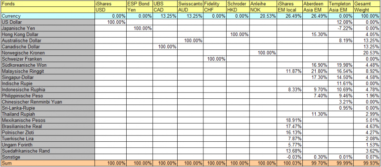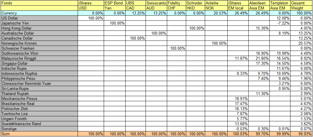 Bei Multi-Währungs-Fonds hast du m. E. das Problem, dass die ihren Währungskorb nach Gutdünken zusammenstellen und du deine Zielallokation nicht unter Kontrolle hast (z. B. der Froschbach, der kürzlich durchs Forum geisterte und mit stolzen 8% des völlig unbedeuteten NZD aufwartet).