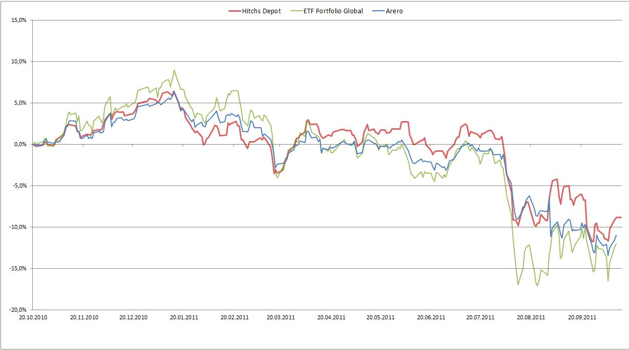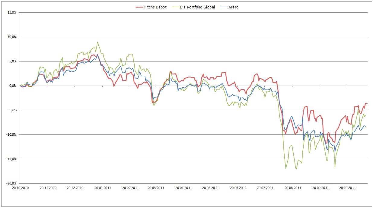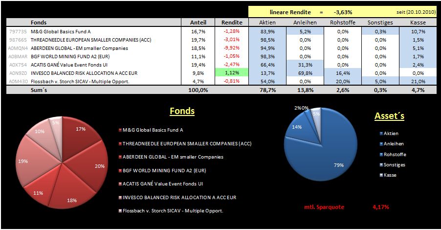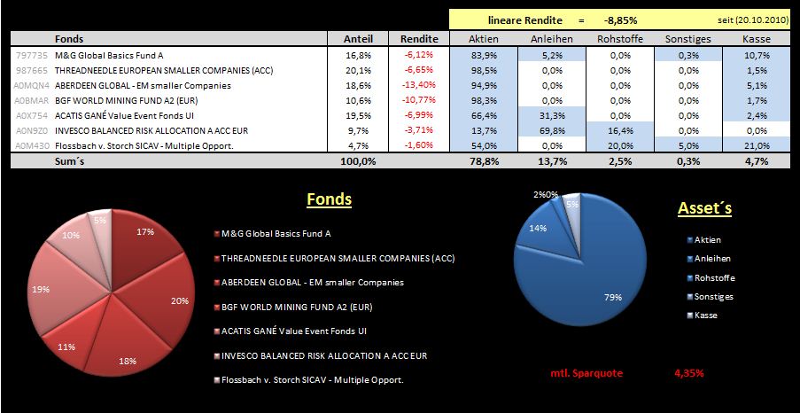 Hitch Oktober 11, 2011 So dann starten wir mal wieder! Nachfolgend mein aktuelles Fonds-Spar-Depot. Wie man sieht hat es im Crash gut gelitten! War mein erster Crash und als Techniker hätte man eigentlich die magische 6900 im Dax erkennen müssen, naja. Hab mich dann ab dem 4. August entschieden durchzuhalten und hab wehement nachgekauft. Weiterer Plan ist die reinen Aktienfonds in die gemischten umzuschichten. Die Rendite bezieht sich auf das letzte Große umschichten im letzten Jahr und gilt seit dem 22.10.2010. Es ist aus den letzten Jahren viel mehr (positive ) Rendite vorhanden, nur nicht mit dargestellt. Kann ich bei interesse gern mit am Ende des Jahres posten? Und hier der Vergleich mit den Passiven: Diesen Beitrag teilen Link zum Beitrag