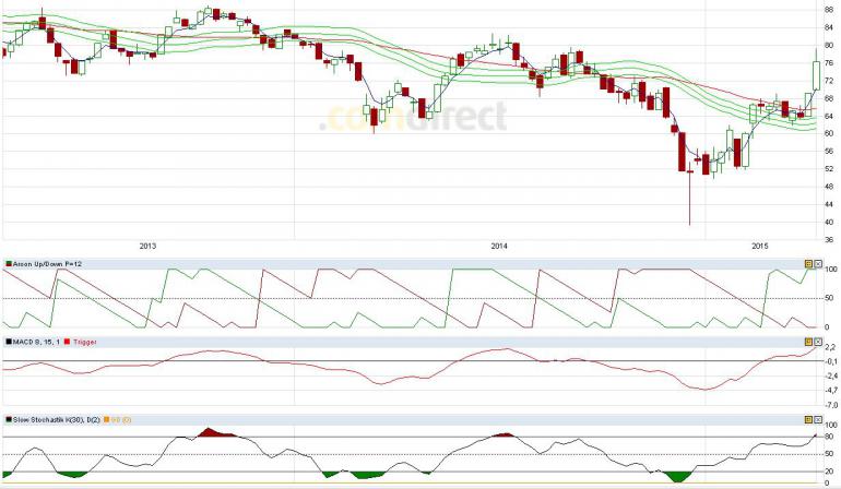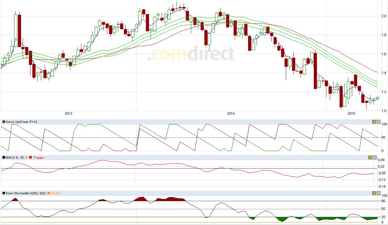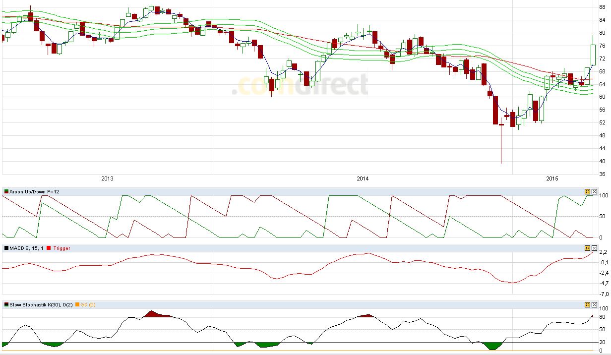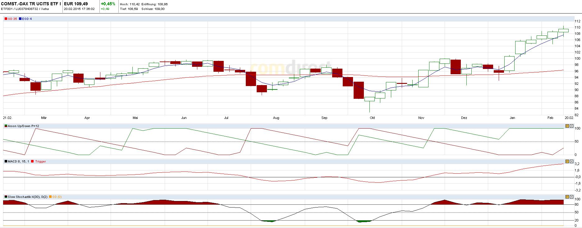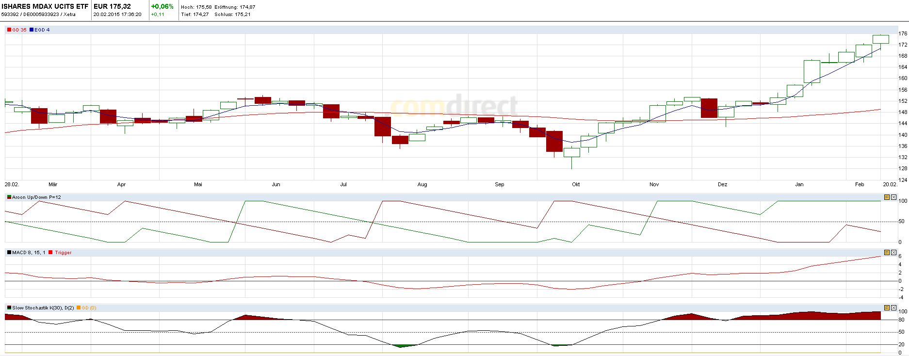 chart Februar 21, 2015 Hallo chartprofi, hätte nicht gedacht, dass hier noch weiteres Interesse besteht, aber weil du es bist, stelle ich eine aktuelle Grafik rein. Ohne die Grafik zu sehen, kann ich jetzt schon sagen das wir immer noch einen steigenden Trend haben. Aber, aus der letzten Grafik vom 11.08.14 war ein Verkaufssignal beim MDAX am 18.7. bzw. am 25.7.14 zu sehen. Beim DAX war es etwas später. Das kann man nun als Fehlsignal deuten oder als Schonung der Nerven. Denn bis etwa 21.11.2014 ging es seitwärts mit einer leichten fallenden Tendenz. Ab den 21.11.2014 etwa ging es bis heute wieder aufwärts. Also im nachinein wäre es nicht so schlimm gewesen, wenn man investiert geblieben wäre. Zu dem damaligen Zeitpunkt wäre es auch nicht so schlimm gewesen, wenn man verkauft hätte. Über den Sommer bis in den Herbst hätte man seine Nerven geschont, falls man nicht so gelassen wäre. Viel verloren oder gewonnen hätte man in beiden fällen nchts. Der MSCI World hat z.B. seit Mitte 2011 kein Verkaufssignal mehr geliefert und seit dem läuft er in einem stabilen Aufwärtstrend. Beim Ishare STOXX Europe 600 gab es von August 2014 bis Anfang Dezember 2014 eine Seitwärtsbewegung, wobei auch hier das Trendfolgemodel nur ein Verkaufssignal anzeigte und kein weiteres Fehlsignal generierte. Für den DAX gab es auch nur ein Verkaufssignal und kein weiteres Fehlsignal. Wenn die Volatilität größer gewesen wäre, dann hätten wir auch mehr Fehlsignale gesehen. Diesen Beitrag teilen Link zum Beitrag