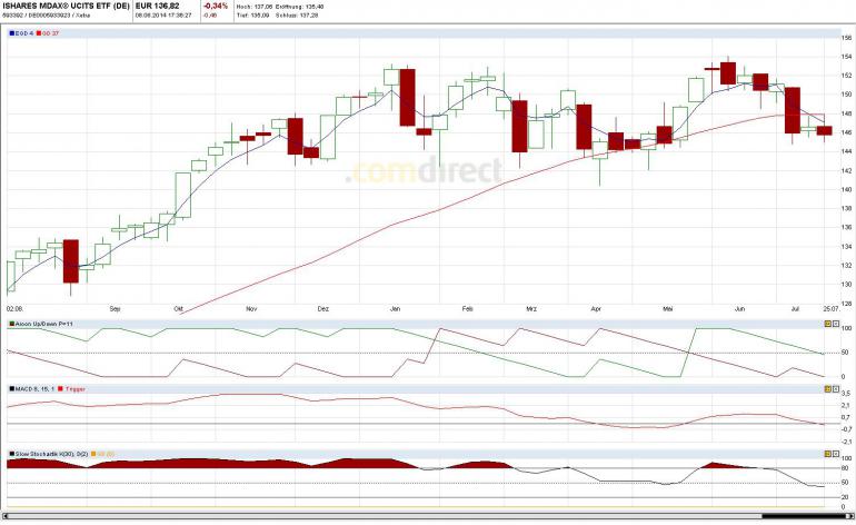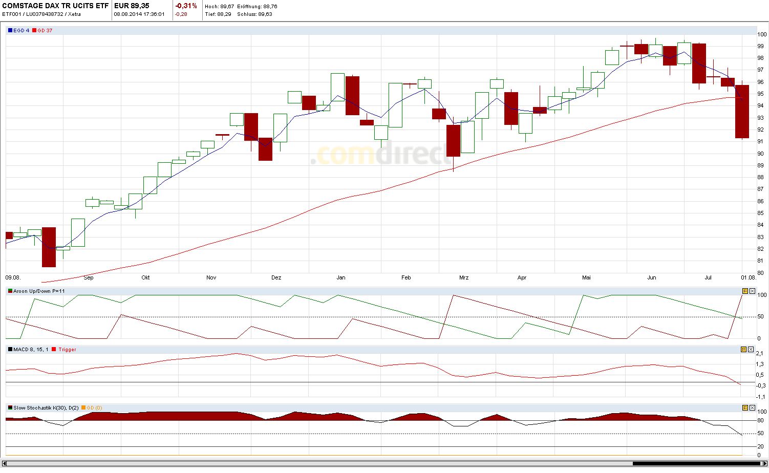 chart August 10, 2014 Da es nun abwärts ging und geht, hier die Charts und die Indikatoren die ein Verkauf anzeigen. Mal sehen ob es ein Fehlsignal ist. Irgendwie gibt es Parallelen zu 2011. Im Musterdepot wurde der MDAX und der DAX verkauft. Am 11.08.14 wird 20% des Kapitals ein short DAX gekauft Diesen Beitrag teilen Link zum Beitrag