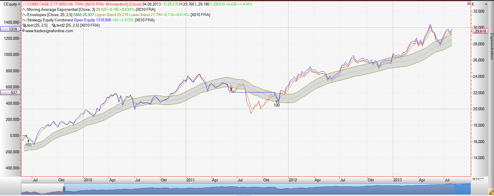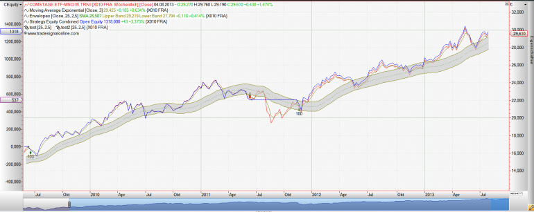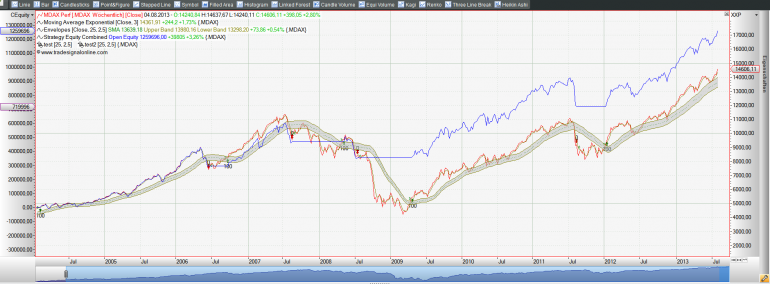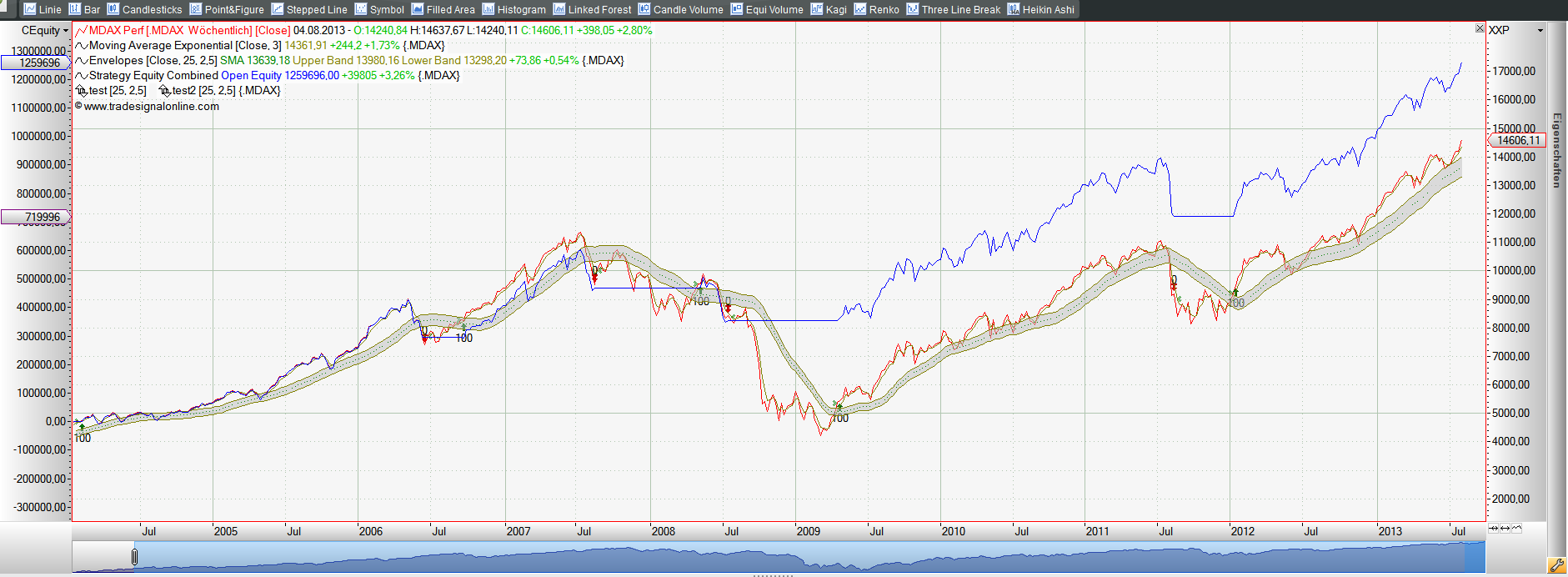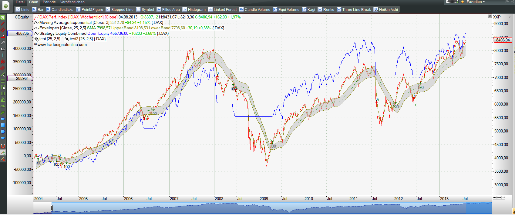 chart November 7, 2013 Hier sind mal noch die Charts die Chem mir geschickt hatte. Vorallem beim Dax kann man gut sehen, dass man die ersten 4 Jahre hinter dem Index hinter her läuft. Erst nach einem starken Einbruch, ist der Index schlechter. Es scheint auch so zu sein das der Dax für ein Trendfolgemodel nicht unbedingt geeignet ist. Besser ist ein Index der wesentlich mehr Werte enthält und weniger volatil ist. Diesen Beitrag teilen Link zum Beitrag