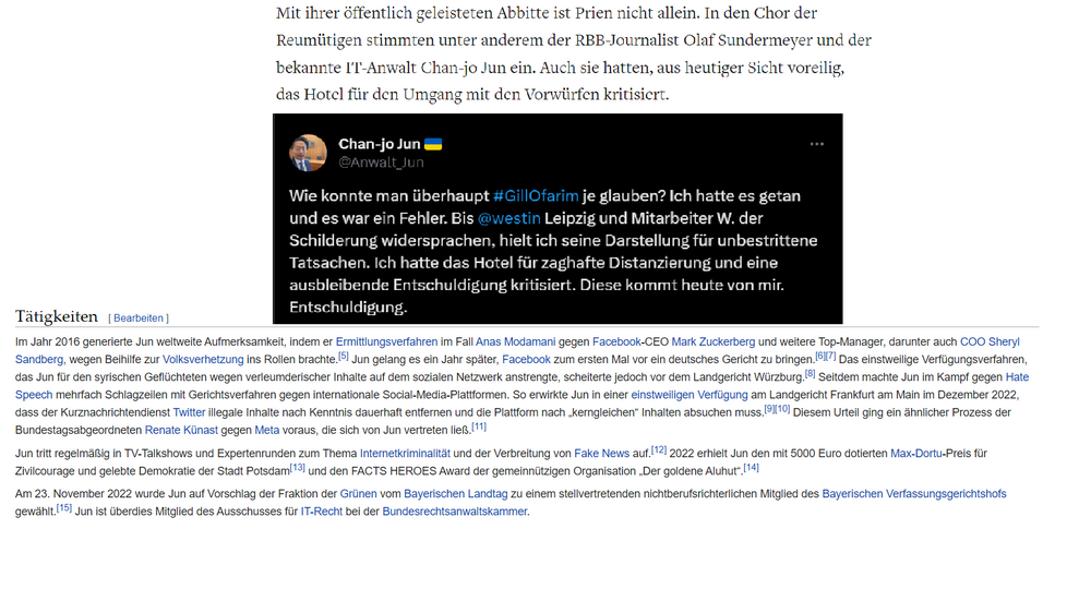 ein_johannes Dezember 1, 2023 · bearbeitet Dezember 1, 2023 von ein_johannes Hallo, ich wollte nachfragen, gegen welche Forumsregel ich ich mit meinem Post im Thread verstoßen habe. Ich postete dort folgendes Bild: Wir sehen hier einen Zusammenschnitt aus der Welt (https://www.welt.de/vermischtes/prominente/article248788398/Fall-Ofarim-Stellvertretende-CDU-Vorsitzende-Prien-bittet-um-Entschuldigung.html), von X (https://twitter.com/Anwalt_Jun/status/1729620413137682919 [seinem eigenen Account]) und Wikipedia (https://de.wikipedia.org/wiki/Chan-jo_Jun) Das ein vielfach wegen des Kampfes gegen Hatespeech, FakeNews, mit dem "FACTS HEROES Award" etc. ausgezeichneter Anwalt alleine aufgrund eines einzigen, völlig frei erfundenen Videos jegliche Prinzipien über Bord wirft - was, wenn nicht das ist denn im Absurditäten-Thread zuhause ? Der Mann ist ja nicht irgend ein Influencer-Trottel, der sitzt als Stellvertreter im bayrischen Verfassungsgericht !!!! Viel mehr kann man doch nicht versagen ?! Was ist denn noch absurder als das ? In jedem halbwegs seriösen Schmierblatt schreibt man doch wenigstens Alibimässig "unschuldig bis zur Verurteilung" - hier ist offensichtlich selbst "Spitzenpersonal" dazu nicht in der Lage. Davon abgesehen, ich habe mir soeben noch mal sämtliche Regeln des Forums durchgelesen und würde doch gerne mal wissen, gegen was und wen ich hier genau verstoßen habe. Ich bin mir keinerlei Schuld bewusst. Weder sind meine Quellen tendenziös (welt.de ? eigene Threads von twitter ? Wikipedia (sehr wohlwollend für ihn formuliert) ?, noch verdrehe ich hier Tatsachen. Hier wird nichts aus dem Zusammenhang gerissen - also, weshalb wurde der Post spurlos gelöscht ? Er wurde ja nicht mal ins Löschpapier-Forum verschoben etc... Diesen Beitrag teilen Link zum Beitrag