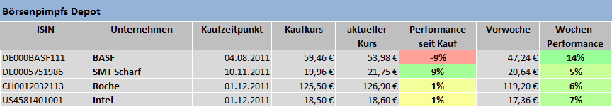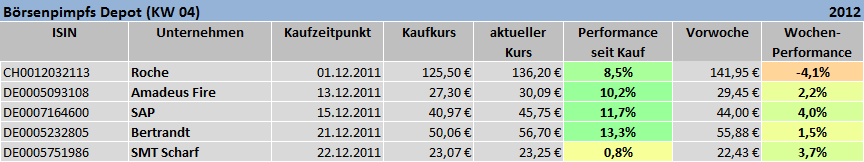 Wenigstens Roche als eher defensiver Wert hat sich diese Woche positiv entwickelt. Hier mein ziemlich dezimiertes Depot: