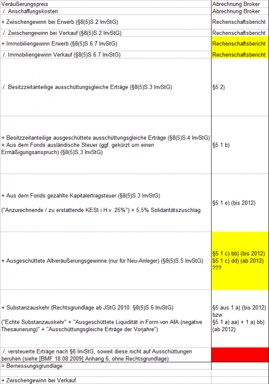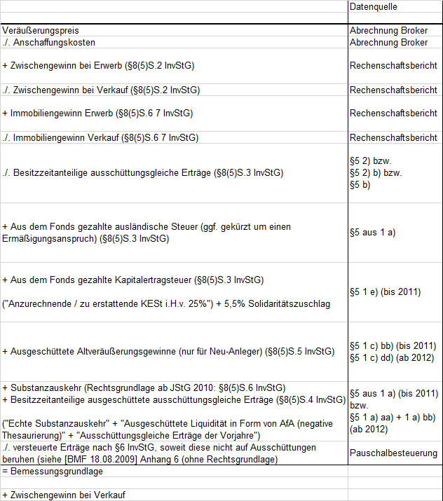 sparfux November 24, 2014 · bearbeitet November 24, 2014 von sparfux Anfang diesen Jahres habe ich 3 Offene Immobilienfonds verkauft, bei denen mir leider die Anschaffungsdaten abhanden gekommen sind. ... was ein Mist. Nun stehe ich vor der "ehrenvollen" Aufgabe, die Steuer händisch berechnen zu müssen. Darum habe ich mich heute nochmal den halben Tag mit Taxi's Rechnungsansatz für die Besteuerung von OiFs auseinandergesetzt: Vollständig müsste es so sein: Veräußerungspreis ./. Anschaffungskosten + Zwischengewinn bei Erwerb (§8(5)S.2 InvStG) ./. Zwischengewinn bei Verkauf (§8(5)S.2 InvStG) ./. Besitzzeitanteilige ausschüttungsgleiche Erträge (§8(5)S.3 InvStG) + Besitzzeitanteilige ausgeschüttete ausschüttungsgleiche Erträge (§8(5)S.4 InvStG) + Aus dem Fonds gezahlte Kapitalertragsteuer und ausländische Steuer (ggf. gekürzt um einen Ermäßigungsanspruch) (§8(5)S.3 InvStG) + Ausgeschüttete Altveräußerungsgewinne (nur für Neu-Anleger) (§8(5)S.5 InvStG) ./. Besitzanteiliger Immobiliengewinn (§8(5)S.6 7 InvStG) + Substanzauskehr (Rechtsgrundlage ab JStG 2010: §8(5)S.6 InvStG) ./. versteuerte Erträge nach §6 InvStG, soweit diese nicht auf Ausschüttungen beruhen (siehe [bMF 18.08.2009] Anhang 6, ohne Rechtsgrundlage) = Bemessungsgrundlage Diese Übersicht findest Du z.B. in Maier, Peter / Wengenroth, Thomas, Änderungen bei der Besteuerung von Erträgen aus Investmentfonds, ErbStB 2009 1/2009, S. 19ff. Der eine Autor (Peter Maier) ist Mitarbeiter des BVI im Bereich Steuern. Ich habe mir eine Excel-Datei erstellt und geschaut, wo ich die entsprechenden Werte her bekommen kann. Dazu habe ich das obige Rechenschema ein wenig umgestellt, damit es besser zu den Angaben in den Rechenschaftsberichten bzw. den Besteuerungsgrundlagen nach §5 passt. Das möchte ich hier mal zur Diskussion stellen und auch noch einige Fragen zu offenen Punkten stellen. Hier mein adaptiertes Rechenschema: Hier meine Fragen: Allgemein: Passt das Rechenschema bzw. die Quellenangaben soweit? Gibt es möglicherweise Updates zu dem Rechenschema? Gibt es da Fehler oder habe ich was vergessen? Immobiliengewinn Ich weiß, dass Taxi und Taxadvisor den Immobiliengewinn, der in % im Rechenschaftsbericht des Fonds angegeben wird, auf die Anschaffungskosten bzw. den Verkaufserlös beziehen. Das macht logisch betrachtet für meine Begriffe aber gar keinen Sinn. Zu einem gewissen Termin ist der Immobiliengewinn eine absolute Größe. Wenn man ihn (merkwürdigerweise) in % angibt, kann er sich eigentlich nur auf den NAV beziehen. Der eigentliche Verkaufspreis, speziell bei in Abwicklung befindlichen Offenen Immobilienfonds, ist ja der Fondsgesellschaft total unbekannt. Vielleicht kann da ja nochmal ein Experte die Hintergründe kommentieren, worin die Logik besteht, den Immobiliengewinn auf die Anschaffungskosten bzw. den Verkaufserlös zu beziehen? Ausgeschüttete Altveräußerungsgewinne (nur für Neu-Anleger) (§8(5)S.5 InvStG) Hier bin ich mir unsicher, ob die von mir angegebenen Ziffern aus de §5-Bescheinigung so stimmen. Speziell 1) c) bb) (vor 2012) ist mir nicht ganz klar, da auch Taxi hier im Thread unsicher war. Gibt es da mittlerweile neue Erkenntnisse, wie man diesen Punkt ordnungsgemäß aus der Besteuerungsgrundlage ermittelt? versteuerte Erträge nach §6 InvStG, soweit diese nicht auf Ausschüttungen beruhen (siehe [bMF 18.08.2009] Anhang 6, ohne Rechtsgrundlage) Dazu habe ich leider bisher gar nichts gefunden. Worum handelt es sich dabei eigentlich? Hier wäre ich für Tipps dankbar, wie man diesen Wert ermitteln kann bzw. welche Ziffern aus der §5-Bescheinigung hier Anwendung finden. Ist ein ziemlicher Mist. Ich glaube ich habe noch nie was so kompliziertes im Steuerbereich gemacht. ... man wächst mit seinen Aufgaben. Bin für jeden Tipp und jede Hilfe dankbar!!! Diesen Beitrag teilen Link zum Beitrag