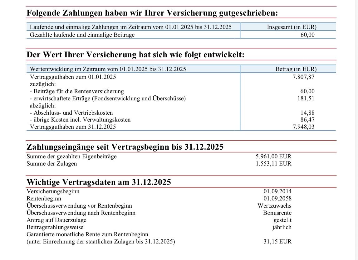 Pamapama 16. Januar @satgar vielen Dank!! Ich schichte die Verträge gemäß deinem Vorschlag nach um. Condor: Sicherungsfond auf DWS Garant 80 ETF-Portfolio-EUR + Vanguard mit minimaler Geldmarkt Beimischung zur Stabilisierung. Nürnberger: Aktienanteil schichte ich ebenfalls in ETF um. Nur noch den iShares Core MSCI Europe UCITS ETF IE00B4K48X80 Nachtrag Rendite 2025 Condor C70 meiner Frau: 31.12.2024 2996,17€ +1075€ Förderung +60€ Eigenbeitrag = 4131,17€ 06.01.2026 4282,63€ = +3,66% Rendite nach Kosten Diesen Beitrag teilen Link zum Beitrag