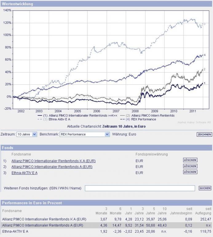 ghost_69 Januar 3, 2012 Hallo Moneycruncher Ich wollte erst gar nicht auf Deinen Beitrag anworten, doch ich dachte im Neuen Jahr mal alle Augen zudrücken, bitte stelle zukünftig Deine Fonds erstmal vor, bevor wir Dir einen Kommentar geben dürfen. Hier die beiden Datenblätter dazu: Allianz PIMCO Internationaler Rentenfonds A (EUR).pdf Allianz PIMCO Internationaler Rentenfonds K A (EUR).pdf Hier ein Vergleich mit dem REX: Ich würde keinen Rentenfonds kaufen, nicht den und auch nicht den anderen, wenn dann eher den REX oder einen Fonds der auch andere Dinge hat Board hat. Ghost_69 :- Diesen Beitrag teilen Link zum Beitrag
