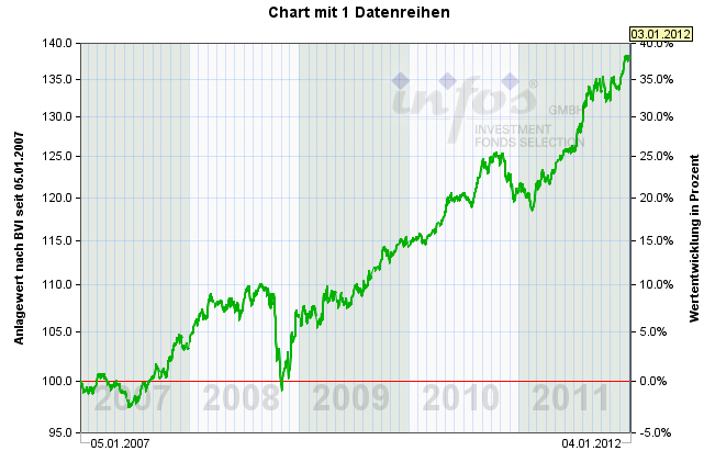 Jose Mourinho Januar 4, 2012 Investmentansatz: Ziel der Anlagepolitik ist es, einen marktgerechten inflationsgeschützten Ertrag (real return) zu erhalten und langfristig einen Schutz des Kapitals vor inflationsbedingtem Wertverlust zu erreichen. Für den Fonds werden überwiegend inflationsindexierte Anleihen höchster Bonität in- und ausländischer Aussteller erworben. Daneben kann auch in sonstige verzinsliche Wertpapiere, Wandelschuldverschreibungen und Optionsanleihen in- und ausländischer Aussteller investiert werden. Die Fremdwährungspositionen sind weitgehend gesichert. Stammdaten: Fondswährung EUR Fondsvolumen (30.09.2011) 136,10 Mio. EUR Fondsdomizil Deutschland Auflagedatum 20.10.2004 Geschäftsjahresende 31.03. Ertragsverwendung Mischformen Ausschüttungstermin28.06. Vertriebsprovision 2,000% Verwaltungsvergütung 0,72% Depotbankvergütung 0,08% TER 0,86% Fondsmanager Herr Dr. Holger Brauer Verwaltungsgesellschaft Nomura Asset Management Deutschland KAG mbH Internet: http://www.nomura-asset.de Kennzahlen (1 Jahr) Volatilität 4,50% Tracking Error 2,95% Information Ratio 1,65% Sharpe Ratio 1,83% Wertentwicklung in den vergangenen 12 Monats-Perioden: 03.01.2011 03.01.2012 13,38% 30.12.2009 03.01.2011 6,36% 30.12.2008 30.12.2009 7,03% 02.01.2008 02.01.2009 2,34% 03.01.2007 03.01.2008 4,67% Fondsperformance: Diesen Beitrag teilen Link zum Beitrag