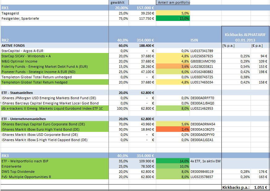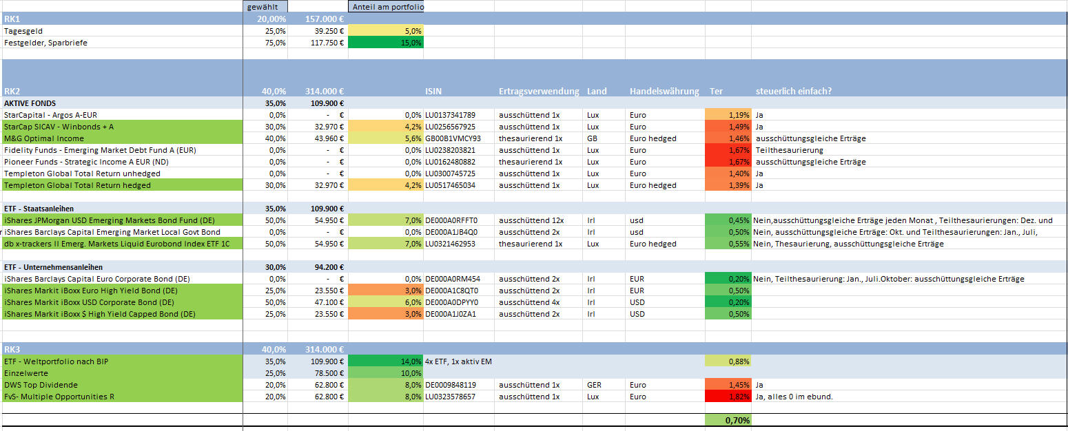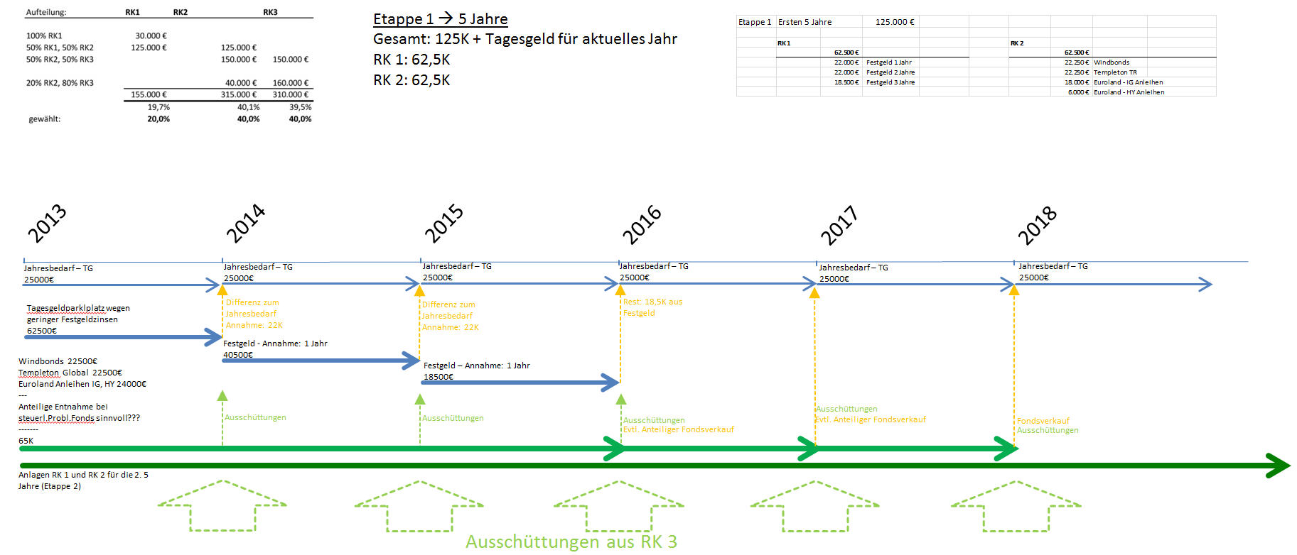 Frankman77 Januar 2, 2013 Ein gutes neues Jahr an alle Mitleser! Ich habe mich mal an einer Aufteilung versucht. Dazu habe ich obige Fonds mit entsprechender Gewichtung angenommen. Ich bin mir nicht ganz sicher, ob die Gewichtung der Anlagen zueinander in RK 2 so ok ist. Ich habe mich für die aktiven Varianten als "Ersatz" für die EM Anleihen und die Euro Anleihen entschieden, zwecks Anbieterdiversifikation. So hatte ich es in diesem Beitrag von Ceekay gelesen. Bei dieser ersten Etappe (2013 + 5 Jahre) habe ich folgendes Entwickelt: Ich habe die Entnahmen anteilig der Gesamten Anlagen in diesen Risikoklassen gewählt. Der untere Pfeil sind die restlichen Anlagen für die nächsten 5 Jahre... da fang ich jetzt mit an. Bei den Festgeldern, die ich erstmal für 1 Jahr angesetzt habe, hatte ich auch an Anleihen mit guter Bonität gedacht?? Zumindest fände ich ein paar festverzinsliche Direktanlagen in RK2 ganz interessant.Was mient Ihr? Ich finde es irgendwie unangenehm, wenn ich für jede Etappe ein eigenständiges Depot führen würde, weil ich z.B. den Templeton Global sowie die Starcaps auch für weitere Etappen nutzen wollte... evtl. bei einem Kickbackanbieter wie Alphatarif, speziell für alle aktiven. Finde ich schwierig, diese zu trennen . Wenn ich jetzt ein ebase Depot über Alphatarif habe, könnte ich noch ein weiteres über avl haben? bzw. macht so etwas Sinn?? Also die Verteilung auf verschiedene Depotstellen wird auch noch einmal eine Herausforderung, wobei ich aber keine Erbsenzählerei betreiben möchte....Die Kickback, denke ich könnten aber schon interessant sein bei dem Volumen... oder? Gruß Frank Diesen Beitrag teilen Link zum Beitrag