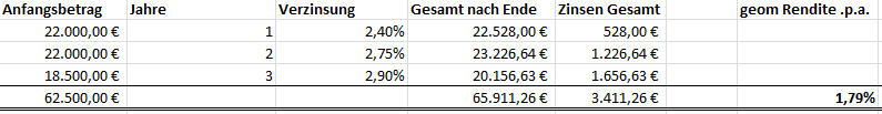 boll Januar 5, 2013 · bearbeitet Januar 5, 2013 von boll Durchschnittlich ergibt sich für die drei Jahre eine Rendite von 1,79% p.a. - naja. Hallo Frank, du vergisst, dass du nach Ablauf des ein-, bzw. zweijährigen Festgelds das freigewordene Kapital wieder anlegen kannst. Die von dir berechnete durchschnittliche geometrische Rendite nach drei Jahren ist somit ein Trugschluss; edit: es sei denn, du legst das Geld solange unter's Kopfkissen. Diesen Beitrag teilen Link zum Beitrag