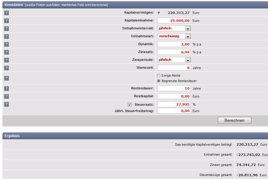 Frankman77 Dezember 28, 2012 · bearbeitet Dezember 28, 2012 von Frankman77 irgendwie verstehe ich die Berechnung nicht so ganz... Wenn ich z.B. eine Verzinsung von 6,94% ansetze anstelle von 5 Prozent wegen der Inflation, dann verringert sich ja die anzulegende Summe... Hab da gerade einen Gedankendreher... Da Ding was ich nicht verstehe ist, dass ich nun mit den höheren Zinssätzen, geringere Anlagebeträge brauche (weil ja höher Verzinst..), aber da stimmt doch was nicht, oder wie ist das zu verstehen? Diese 6,94% könnte ich mit den Restrenditen p.a. vergleichen, die es für Anleihen gibt, richtig? ..Die Planung mit den Fälligkeiten wäre dann das nächste Richtig? Macht diese Berechnung so Sinn?: die Entnahmen wären dann der Inflation (Dynamik) angepasst. Diesen Beitrag teilen Link zum Beitrag