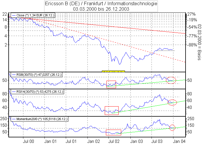 Aktiencrash Dezember 23, 2003 Bei der Ericsson B Aktie könnte eine Beendigung des Aufwärtstrends bevorstehen. Noch sind die pos. Konvergenzen (grün) intakt. Die Indikatoren befinden sich jetzt genau auf den Konvergenzen (rote Kreise). Der Schlußkurs muß jetzt in 2 Wochen über 1,41 schließen. Sollte dies nicht geschehen, dann werden alle Indikatoren ein Verkaufsignal generieren (bruch der Konvergenz). Mittelfristig gehe ich von einem erneuten Kursverfall aus, da alle Indikatoren ein neues Tief (rote Rechtecke) gebildet haben und die jetzige pos. Konvergenz mir zu steil erscheint. Diesen Beitrag teilen Link zum Beitrag