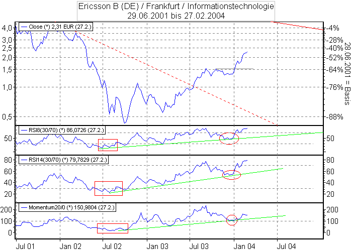 Aktiencrash Februar 28, 2004 Mal wieder einen Blick auf die Ericsson B Aktie werfen . Na und wie man gut erkennen kann, hat die pos. Konvergenz (grün) bei allen Indikatoren gehalten . Die Aktie ist im Augenblick etwas stark überkauft und ist somit nicht gerade eine Kaufgelegenheit. Würde daher keinen Einstieg empfehlen, sondern nur halten. Diesen Beitrag teilen Link zum Beitrag