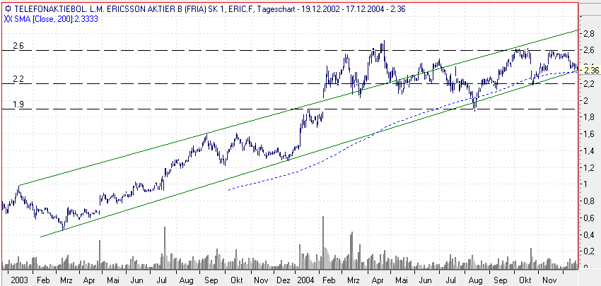 et3rn1ty März 12, 2005 Hallo Community. Wie geht es wohl mit Ericsson weiter? Die Auftragslage ist meiner Meinung nach deutlich höher als erwartet, gerade in Asien ist die Nachfrage nach Netzwerkausbau sehr hoch. In Thailand steht man (u.a. auch Siemens und Marubeni Telecom) in Verhandlungen mit TOT (Thailands Telekom). Es geht um einen Auftragswert von ca. 1 Milliarde Euro. (hier der Link) Die Cebit rollt jetzt den UMTS Boom wieder auf und die Nachfrage nach neuen Handymodellen steigt stetig. Dann steht noch die 3. UMTS Generation vor der Tür. Also wie soll es weitergehen? Momentan ist bei Ericsson an der Börse eher ein Seitwärtstrend zu beobachten. Die Unterstützungen bei 2,15 und letzte Woche bei 2,24 sind stabil. Momentan ist der nächste Widerstand bei 2,40 zu sehen. Also, was denkt Ihr? Wo steht Erisson in nächster Zeit? Meine Einschätzung: Bis zum Sommer sollte der Widerstand bei 2,40 deutlich durchbrochen sein. Grüße, et3rn1ty. Diesen Beitrag teilen Link zum Beitrag