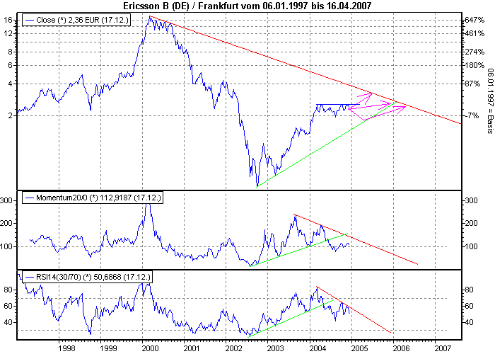 Aktiencrash Dezember 18, 2004 .......und meine Meinung ist, das man jetzt mit einem Einstieg aufpassen sollte ! Die Aktie nähert sich dem Abwärtstrend (rot). Die violetten Pfeile geben einmal die 3 möglichen mittelfristigen Szenarien wieder. Wenn ich mir die Indikatoren mit ihren neg. Divergenzen (rot) ansehe, dann neige ich eher dazu für einen kurzfristigen/mittelfristigen Abwärtstrend/Seitwärtstrend zu pledieren. Somit würde die Aktie in Richtung mittelfristigen Aufwärtstrend (grün) davon ziehen. Zumal der RSI erst vor kurzen wieder vor der Divergenz nach unten wendete. Außerdem würde der RSI bei einem Seitwärts/Abwärtstrend dem überverkauften Bereich näher kommen, was erneutes Aufwärtspotenzial zum Abwärtstrend (rot) bringen würde. Nach oben liegt der horiz. Widerstand (blau) um die 2,60 . Fazit: Maximales Potenzial sehe ich für die Ericsson Aktie bis zum Abwärtstrend (rot). Kurzfristig sagen die Indikatoren auf Wochenbasis eher einen Abwärtstrend vorraus. Dieser sollte aber spätestens in der Nähe des Aufwärtstrend (grün)beendet sein. Sollte sich die Aktie doch für einen sofortigen Anstieg entscheiden, dann würde ich warten das der horizontale Widerstand (blau) auf Wochenbasis um die 2,60 geknackt ist. Das Gesamtrisiko sehe ich relativ als hoch an für die Ericsson Aktie. Diesen Beitrag teilen Link zum Beitrag