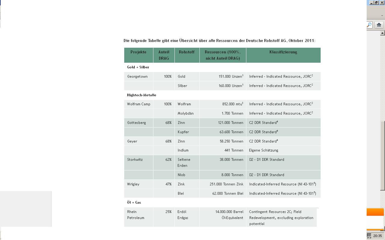 Lensk Februar 27, 2012 · bearbeitet Februar 27, 2012 von Lensk Naja, angesichts der Partnerschaften mit großen Förderern, kann man schon sagen, dass diese ein gewisses Interesse an den Projekten der DRAG haben. Angesichts der Situation an den Rohstoffmärkten hat die DRAG sicher ein interessantes Geschäftsmodell. Man muss sich noch mal genau anschauen, inwieweit die Margen Abschläge an den Märkten kompensieren können. Interessant finde ich auch diesen Bericht der Wiwo: http://www.wiwo.de/t...se/5666986.html Stutzig gemacht hat mich folgende Aussage: "Wir verfügen über eine beachtliche Ressourcenbasis. Der „in-situ"-Wert der Ressourcen, d.h. der Wert der Rohstoffe im Boden, beläuft sich derzeit auf mehr als 10 Milliarden Euro." Inwiefern hat dich diese Aussage stutzig gemacht? Diesen Beitrag teilen Link zum Beitrag