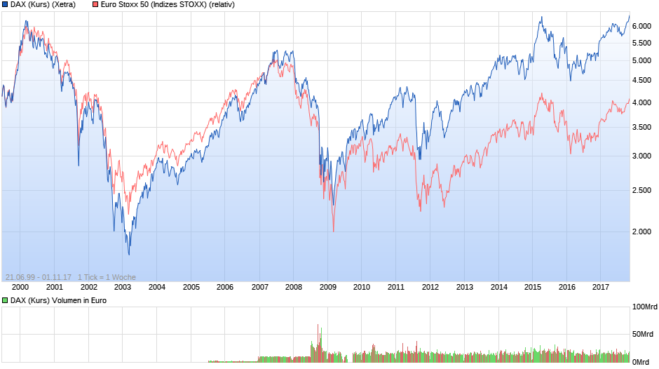 Der Kursindex liegt gerade mal ein paar Pünktchen höher als vor 17 Jahren und der EuroStoxx ist noch kilometerweit entfernt von seinem letztem Hoch. Ich erkenne selbst mit größter Anstrengung keine Übertreibung.
