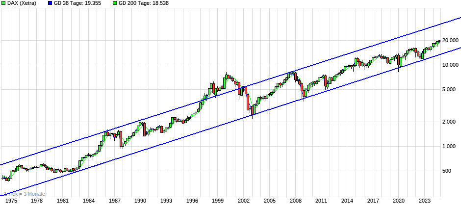 Um das mal ein wenig in den historischen Kontext zu bringen, der langfristige Kursverlauf des DAX folgt einem ziemlich stabilen Trend. Da ist aktuell von Überteibung nichts zu erkennen.