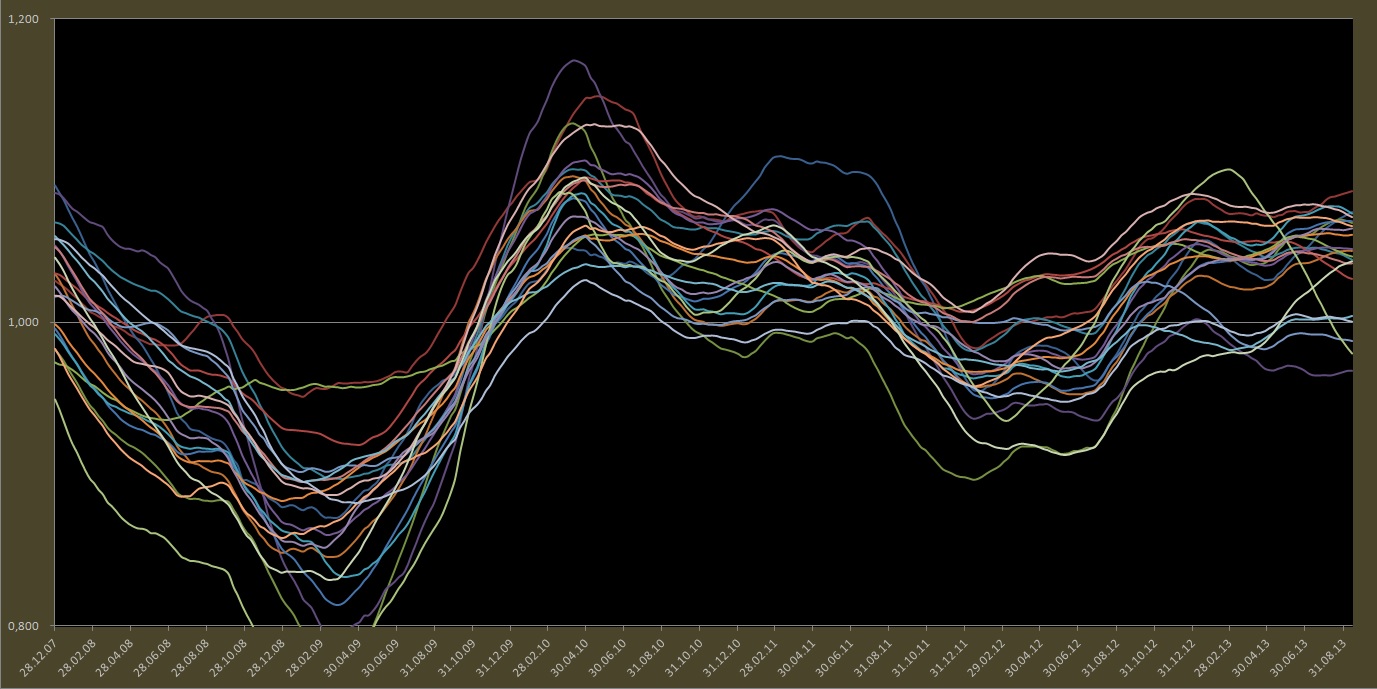 Hier behauptet eine ältere DIW-Untersuchung, der DAX läuft den ifo-Geschäftserwartungen einen Monat voraus, die tatsächliche Lage folgt dann in entsprechendem Abstand. Ich denke das ist bekannt, nur schwarz auf weiß und anhand einer hübschen Grafik kommt das Gedächtnis noch etwas schneller auf Touren. Niedriges Zinsniveau Hopp oder Top, es macht schon einen Unterschied bei einer Investitionsentscheidung von ein paar Millionen, ob der Zinssatz 2,5% oder 4% beträgt. Und das wird sich niederschlagen. es muß ja nicht gleich einen Crash geben, eine ausgedehnte Seitwärtsbewegung kann auch Nerven kosten.