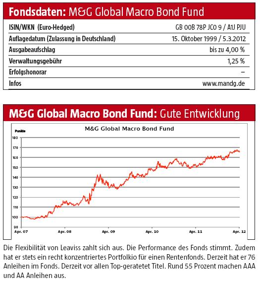 ghost_69 März 10, 2012 M&G Global Macro Bond Fund Die Struktur des M&G Global Macro Bond Fund gibt mir die Freiheit, in unterschiedlichste festverzinsliche Vermögenswerte weltweit in jeder beliebigen Währung zu investieren. Diese Flexibilität ermöglicht es mir, die aktuellen wirtschaftlichen Bedingungen und globalen Trends zu nutzen, um die bestmöglichen Renditen für die Anleger zu erzielen. Auflegungsdatum der Anteilsklasse in Europa: 16.12.2011 Anteilsklasse A (Acc) Währung EUR Anteilspreis (EUR) 10.4263 Veränderung +0.0217 Veränderung (%) +0.2086 ISIN Nummer GB00B78PH718 Das Verkaufsprospekt: Global-Macro-Bond-Prospectus-DE-AT_tcm1487-67135.pdf KIID: global-macro-bond-fund_eur_a_acc_de_kiid_deu_de_gb00b78ph718_tcm1487-67137.pdf Er sei in Dänemark, Deutschland, Finnland, Frankreich, Italien, Luxemburg, den Niederlanden, Norwegen, Österreich, Schweden, der Schweiz und Spanien zum Vertrieb zugelassen. Der Fonds werde seit seiner Auflegung im Jahr 1999 von Jim Leaviss, Leiter Anleihen bei M&G International gemanagt. In den letzten fünf Jahren habe der Fonds eine Rendite von 6,2% pro Jahr erzielt. Der M&G Global Macro Bond Fund sei ein global ausgerichteter "All-Wetter"-Anleihenfonds, der auf einen Gesamtertrag abziele und dabei keinen Einschränkungen unterliege. Das Anlageziel bestehe darin, unabhängig von den jeweils gerade vorherrschenden Bedingungen am Markt positive Erträge zu generieren - und das bei niedrigen Wertschwankungen. Zu diesem Zweck könne der Fonds weltweit in das gesamte Spektrum festverzinslicher Wertpapiere sowie Währungen investieren, um so von aktuellen Marktbewegungen zu profitieren. (Ausgabe vom 05.03.2012) (06.03.2012/fc/n/n) Global ausgerichteter All-Wetter-Anleihenfonds.pdf Hat zufällig jemand ein paar mehr Daten über diesen Fonds, anscheinend gibt es diesen schon länger. Auf den ersten Biss schmeckt er nicht schlecht. Ghost_69 :- Diesen Beitrag teilen Link zum Beitrag