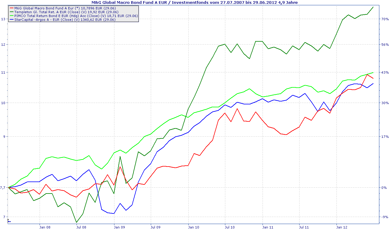 Norbert-54 Juni 30, 2012 Ich habe die Performance ab Mitte 2007 anhand der Historischen Kurse in Pfund nach Euro umgerechnet (Monatsbasis). Ein Vergleich zu einigen anderen Fonds: Der Global Macro hebt sich nicht wirklich ab. Interessant wird es wenn sich die Anleihemärkte abschwächen. Diesen Beitrag teilen Link zum Beitrag