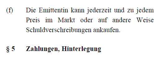 Ramstein Dezember 11, 2012 · bearbeitet Dezember 11, 2012 von Ramstein SINGULUS TECHNOLOGIES startet Rückkaufprogramm für Unternehmensanleihe- Rückkaufprogramm ist zeitlich und im Volumen begrenzt - Ziel der Wachstumsfinanzierung bleibt bestehen Kahl am Main, 11. Dezember 2012 - Der Vorstand der SINGULUS TECHNOLOGIES AG (SINGULUS) hat beschlossen, ein zeitlich und der Höhe nach begrenztes Rückkaufprogramm für die am 23. März 2012 begebenen 7,75% Schuldverschreibungen (2012/2017) zu starten. Das Rückkaufprogramm ist im Volumen auf max. 3,0 Mio. EUR begrenzt. Es beginnt am 11. Dezember 2012 und endet spätestens am 31. März 2013, sollte zu diesem Zeitpunkt noch nicht die maximale Stückzahl erreicht werden. Die mit der Abwicklung betraute Bank soll dabei an einem Tag nicht mehr als 50% des durchschnittlichen täglichen Umsatzes in den Schuldverschreibungen an der Börse, an der der Erwerb stattfindet, erwerben. Der Erwerbspreis der Schuldverschreibungen darf jeweils nicht über dem des letzten unabhängig getätigten Abschlusses oder über dem des im Zeitpunkt des Erwerbs höchsten unabhängigen Angebots an der Börse liegen. Das Rückkaufprogramm kann, soweit erforderlich und rechtlich zulässig, jederzeit ausgesetzt und wieder aufgenommen werden. Die Gesellschaft behält sich vor, die erworbenen Schuldverschreibungen wieder zu veräußern. Das mit der Ausgabe der Schuldverschreibungen bezweckte Ziel der Wachstumsfinanzierung bleibt dabei weiterhin bestehen. SINGULUS finanziert mit den Mitteln der Unternehmensanleihe bereits größere Projekte im Geschäftsbereich Solar, den Ausbau der Systempartnerschaft mit Herstellern von Dünnschichtsolarzellen, die Entwicklung neuer Produkte für Solar und die Entwicklung von Produktionsanlagen für die nächste Generation Blu-ray Discs. Ein wesentlicher Teil der Mittel soll für den Aufbau neuer Geschäftsfelder im Bereich der Vakuum-Beschichtungs-Technologie durch Forschung und Entwicklung sowie durch Akquisitionen von Unternehmen oder Unternehmensteilen verwendet werden. Dr.-Ing. Stefan Rinck, Vorsitzender des Vorstandes der SINGULUS TECHNOLOGIES AG: 'Unsere Bilanz ist stabil und ist mit einer Eigenkapitalquote von rund 40 % nach wie vor sehr solide. DieLiquidität von SINGULUS betrug zum 30. September 2012 65,4 Mio. EUR. Damit sind wir mit ausreichender Liquidität ausgestattet und wir nutzen diese für das interne und externe Wachstum in den nächsten Jahren.' Methode Griechenland: billig einsammeln. Kurs momentan 74. Diesen Beitrag teilen Link zum Beitrag