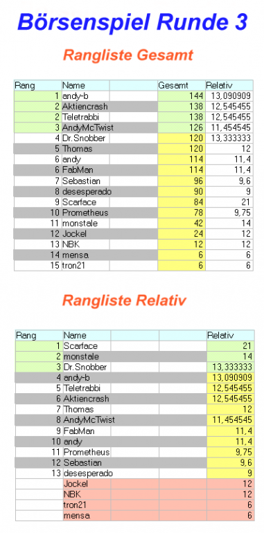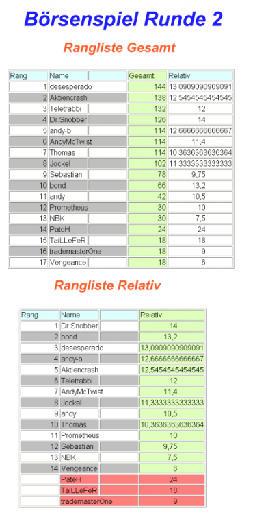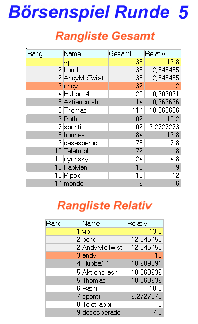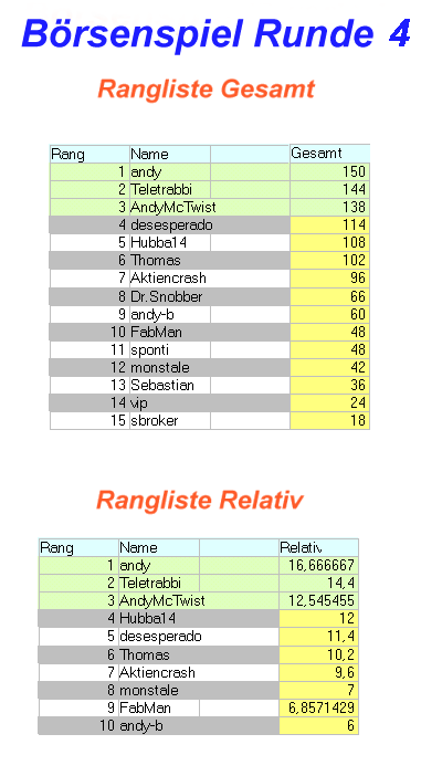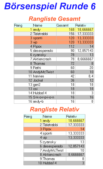 Thomas Dezember 29, 2003 Hier werden die ersten drei Teilnehmer aus vergangenen Börsenspielen aufgelistet. Damit eure Leistungen auch keiner vergisst. B) Ein Rangabzeichen im Profil und Beitragsansicht gibt es auch. Börsenspiel Runde 1 von bis DAX, Euro/Dollar, Öl, Nikkei, BundFuture, Gold Gesamtwertung: 1. Thomas 295 Pkt. (18 Rd.) 2. Aktiencrash 285 Pkt. (17 Rd.) 3. Teletrabbi 260 Pkt. (18 Rd.) Relative Wertung: 1. DowJones Ø16,83 2. Aktiencrash Ø16,76 3. Thomas Ø16,39 Diesen Beitrag teilen Link zum Beitrag