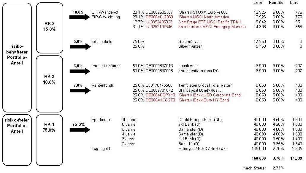 ceekay74 März 26, 2012 Ich habe mir Den Eingangspost nochmals genau durchgelesen und daraufhin meinen Vorschlag angepasst: Vermögen 460 TEUR plus fast abbezahltes Eigenheim "mentaler Stopp-Loss von 20%" auf die ETF-Position interpretiere ich als 5-10% Verlusttoleranz vom Gesamtvermögen Angst vor (Hyper-) Inflation und einer möglichen Währungsreform Bei der Verlusttoleranz kommt m.M.n. kein höherer risikobehafteter Portfolioanteil als 25% in Frage. Den Rest würde ich als Euro-Sparbriefe und Euro-Tagesgeld ohne Währungs- und/oder Kursrisiko und mit Einlagensicherung anlegen. Unternehmensanleihen bei bester Bonität bringen weniger oder vergleichbare Renditen, bergen aber ein Ausfallrisiko. Bei Streuung der Sparbriefe über Laufzeiten und Einlagensicherungssysteme sollte über das Gesamtportfolio eine Rendite von 3,7% vor Steuer drin sein. Ist nicht berauschend, sollte aber in normalen Zeiten die Inflation ausgleichen und das Kapital real erhalten. Gegen eine Hyperinflation oder die Folgen einer Währungsreform kann man sich nicht wirklich schützen, da niemend die Folgen für einzelne Assetklassen vorersagen kann, da hilft nur die Schrotflinte und breite Streuung. Just my 2 cents! Diesen Beitrag teilen Link zum Beitrag