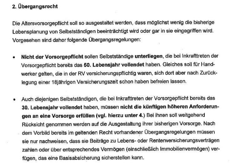 ceekay74 Mai 22, 2012 Zu den geplanten Übergangsregelungen hab ich noch ein "Eckpunktepapier" gefunden: Damit dürfte nur noch heiße Luft für bereits Selbständige über 30 Jahren übrig bleiben, falls zu dem "entsprechendem Vermögen" auch Wertpapiere gezählt werden und die Eckpunkte so umgesetzt werden. Hier das Eckpunktepapier in Gänze: eckpunkte.pdf Diesen Beitrag teilen Link zum Beitrag