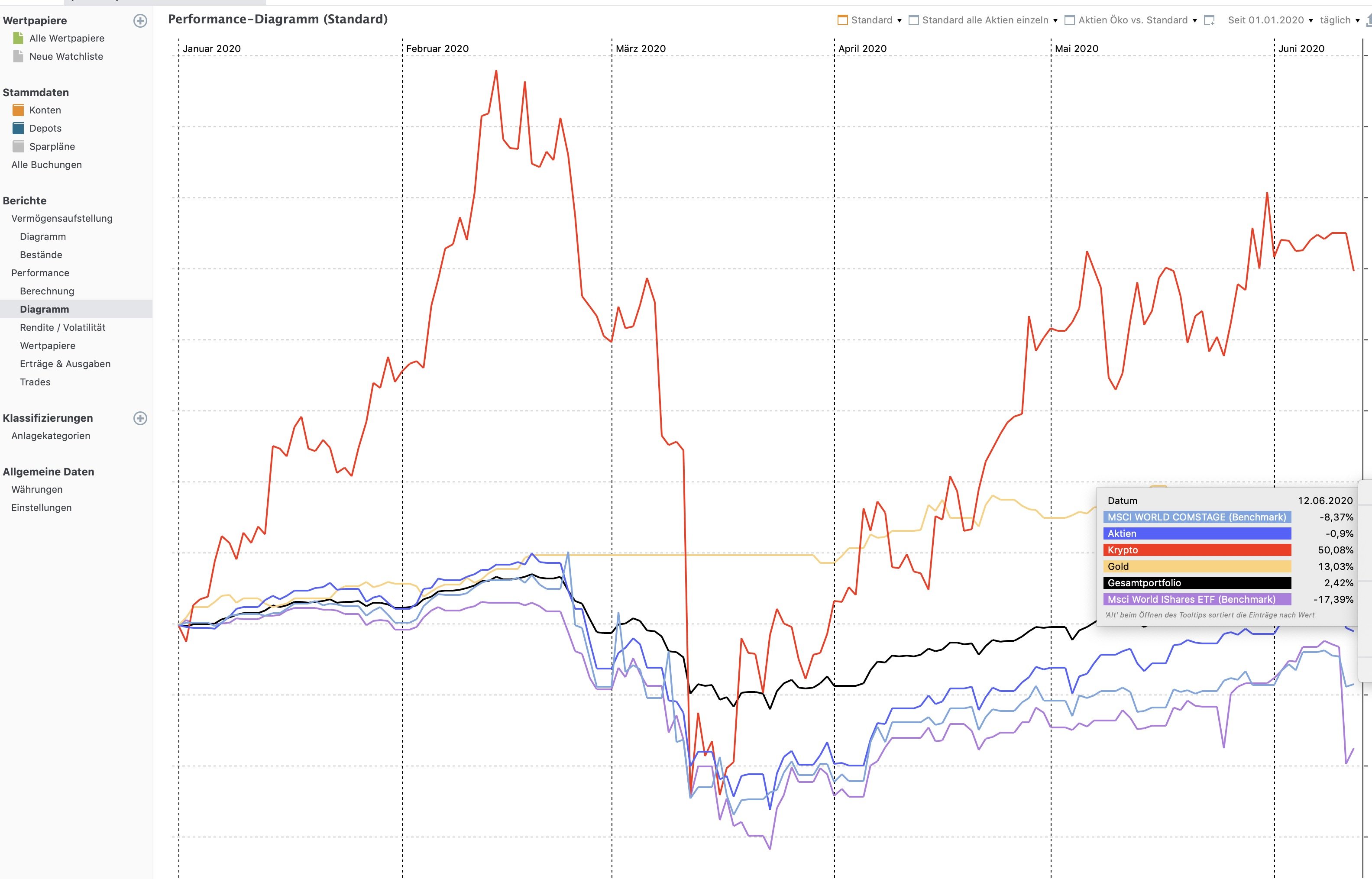Klar hinkt der Vergleich mit Gold und Krypto aufgrund der nicht einberechneten Dividenden. Aber dieses Problem ist an dieser Stelle nicht möglich, wenn es mir vorrangig um den Vergleich zwischen meinem Aktienportfolio und der Benchmark geht.