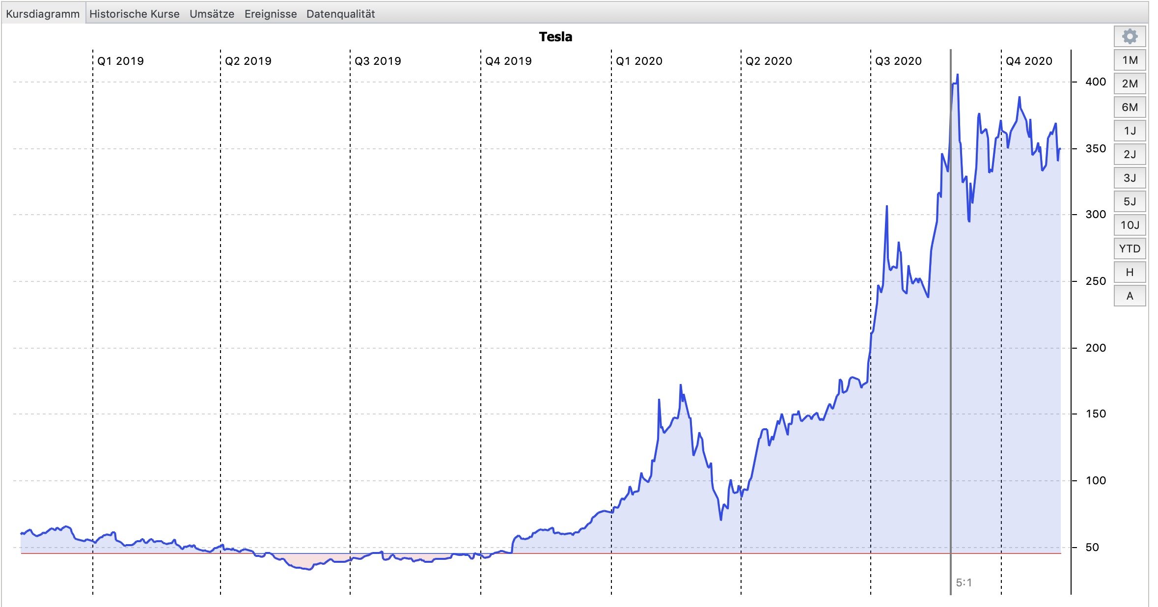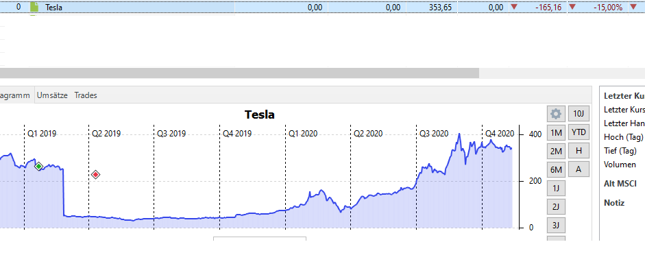 Hier mein Tesla Chart, der sich in etwas auch mit z.B,. diesem hier https://www.ariva.de/tesla-aktie/chart?boerse_id=40&t=3years deckt.