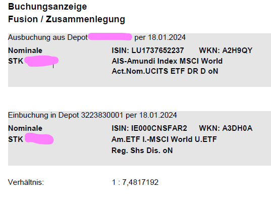 Mir wurden Anteile vom alten ETF ausgebucht und Anteile vom neuen ETF (=fusionierter ETF) eingebucht.