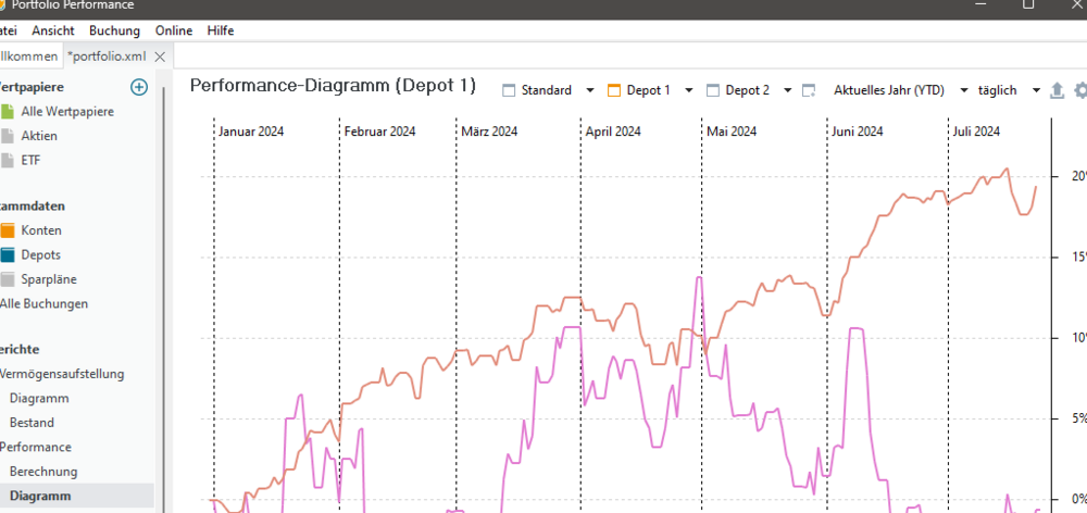 Ich meine unter Performance -> Diagramm die verschiedenen Ansichten. Habe mir dazu z.B. Depot 1 und Depot 2 mit einem Benchmark als Ansicht erstellt. Aktuell steht der Zeitraum auf YTD. Da die Depots zu unterschiedlichen Zeitpunkten starteten, will ich diese mit den entsprechenden Zeiträumen (seit xxx...) verknüpfen. Wenn ich in Depot 1 den Zeitraum z.B. auf "seit 1.1.2023" stelle und die Ansicht zu Depot 2 wechsle, steht dort ebenfalls der 1.1.2023. Wenn ich dann den Zeitraum dort auf 1.1.2024 (Startzeitpunkt des Depot 2) stelle und zurück zu Depot 1 wechsle, steht der Zeitraum immer noch auf "seit 1.1.2024". Es wird beim Wechsel der Ansicht immer der zuletzt ausgewählte Zeitraum angezeigt. Eine Verknüpfung ist anscheinend nicht möglich.
