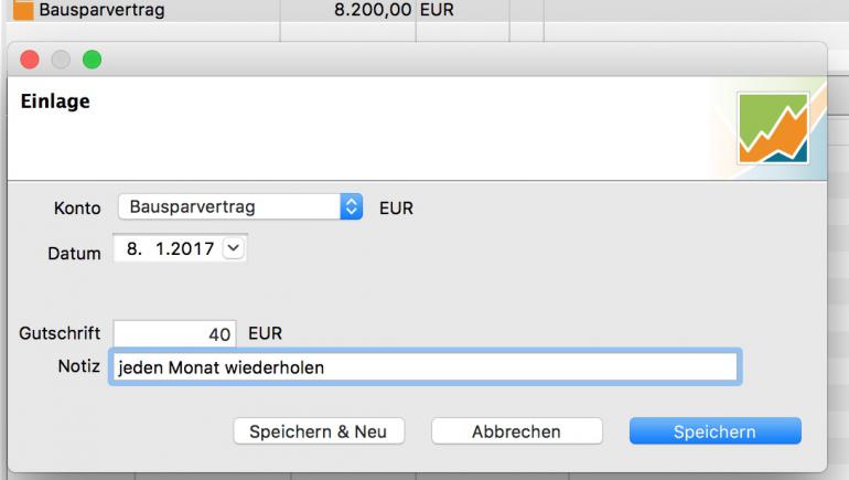 Ich spiegle im Programm meinen Bausparer ab. Hier gehen jeden Monat 40€ Vermögenswirksame Leistungen drauf. Wäre es möglich bei den Einlagen eine automatische Einlage alle X Tage, Wochen, Monate ins Programm aufzunehmen?