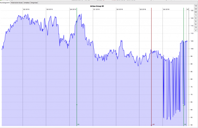 ich habe bei der Aktie von Airbus ein totales durcheinander bei den Kursen, egal welchen Börsenplatz ich wähle, es sind Schwankungen von 60-120 Euro darin, hat einer von Euch eine Erklärung dafür? Das Tickersymbol habe ich auch schon 3 mal geprüft AIR.DE: