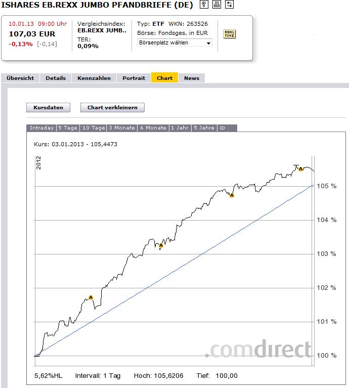 Moneycruncher Januar 11, 2013 Auf Jahressicht... deutschen Jumbos dagegen nur TG-Niveau von ca. 1,25%. Ich hoffe, du hast dir nicht die Kursentwicklung EX Ausschüttungen angeschaut Komisch, zeigt denn das comdirect-Chart nur den Kurs- und nicht das Performancechart? Leider weiß ich nicht wie man Charts hier einfügt, sonst hätte ich´s kopiert. Diesen Beitrag teilen Link zum Beitrag