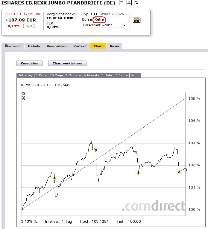 kleinerfisch Januar 13, 2013 · bearbeitet Januar 13, 2013 von kleinerfisch Danke, da hab´ ich wieder was gelernt. Zeigt denn das XETRA-Chart den Kursverlauf und die Fondsgesellschaft den Performanceverlauf? I.d.R. gibt es doch eine Klickbox zur Auswahl von Kurs- oder Performance Chart? Die Klickbox gibt es schon seit einiger Zeit ncht mehr, ebenso wie die für die Umrechnung in EUR Es ist noch merkwürdiger: zB für den 14.09.12 zeigt die comdirect für den iShares Jumbo verschiedene Preise: auf Xetra: 108,20 für Fondsgesellschaft: 106,41 Wie kann das denn sein? Diesen Beitrag teilen Link zum Beitrag
