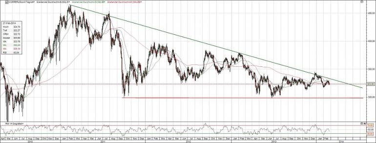 checker-finance März 14, 2014 Es geht los, eine wichtige Marke ist durchbrochen. Das hat man schon lange nicht gesehen: in London: 6430,75 Dollar je Tonne oder gerade Comex: 2,9175 Aber das übersetzt sich noch nicht in die Aktienkurse. Besonders hart dürfte es z. B. Barrick treffen, weil die zwar als Goldproduzent wahrgenommen werden, aber eigentlich eher ein Mischunternehmen mit Konzentration auf Gold und Kupfer sind. Ähnliches Problem bei Newmont Mining und Freeport McMoran. Auch Rio Tinto und BHP Billiton notieren noch knapp unter den Höchstständen, obwohl bei ihnen dazu kommt, dass ein hard landing in China auch ihre Eisen-Produktion trifft. Diesen Beitrag teilen Link zum Beitrag