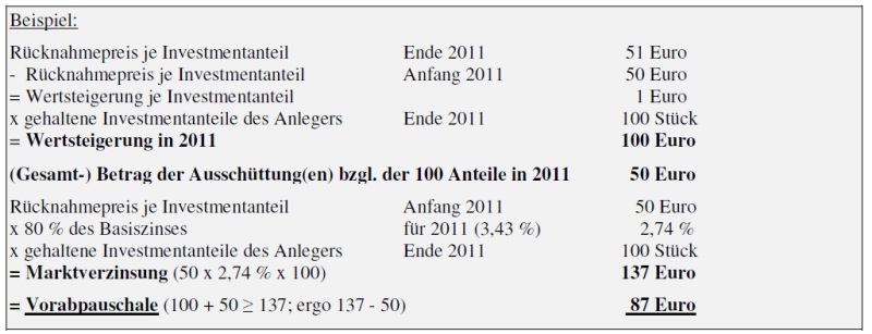 ceekay74 Juli 5, 2012 Kann vielleicht mal jemand mit einfachen Worten erklären, wie sich das Steuerkonzept auswirken würde auf Swap-ETFs, die vor 2009 angelegt wurden? Da wären hier bestimmt viele dankbar (mindestens mal ich :- ). Im besten Fall ändert sich nichts, wenn der Bestandsschutz für Altanlagen erhalten bleibt: Die Arbeitsgruppe nimmt keine endgültige Bewertung vor. Über den weiteren Umfang desBestandsschutzes ist politisch zu entscheiden. Im schlechtesten Fall soll eine jährliche "Vorabpauschale" nach diesem Schema erhoben werden: In Zahlen ausgedrückt: Die gezahlten Vorabpauschalen sollen dann beim Verkauf auf den zu versteuernden Veräußerungsgewinn angerechnet werden. Die Screenshots sind aus dem in Ramsteins Beitrag #4 angehängten Bericht aus "Der Betrieb". Diesen Beitrag teilen Link zum Beitrag